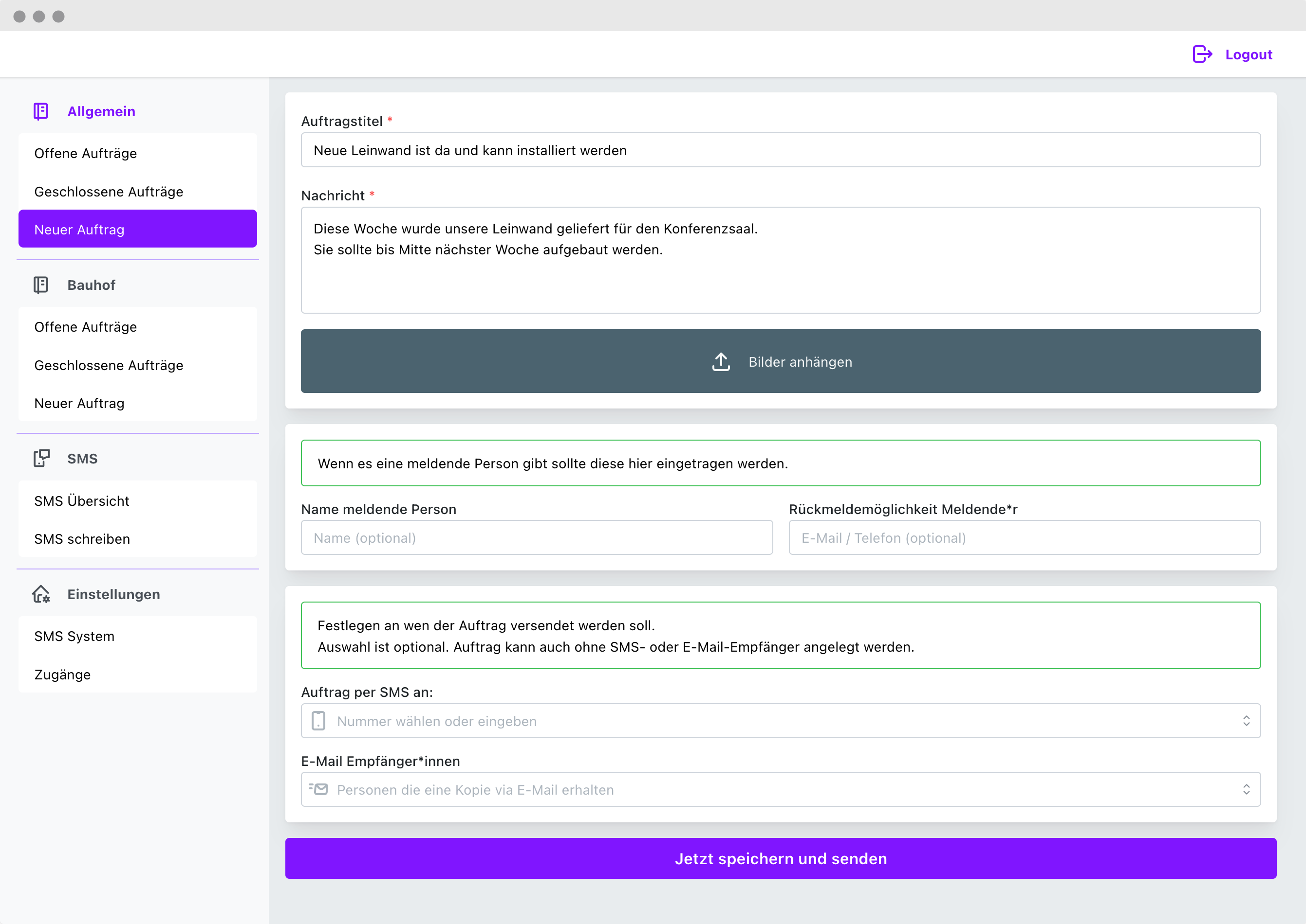 Stellen Sie Aufgaben ein und senden Sie eine Zusammenfassung, per Mail, SMS oder beides an die Personen die es betrifft. Mit Hilfe der Kommentarfunktion kommt eine Aufgabe so schnell zur Lösung.